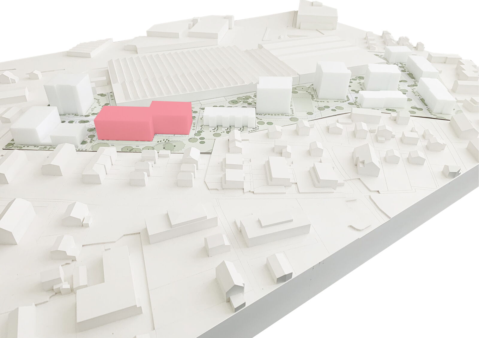 Südlich des Stadtkerns von Thun liegend, gehört das Areal zum eher ländlich suburban geprägten Ortsteil «Gwatt». Das Produktions- und Lagergebäude der Hoffmann-Neopac stellt für die nächsten Jahre eine räumliche Konstante dar. Die städtebauliche Strategie gründet auf den folgenden Pfeilern: «Identifikationsstiftung», «Diversität und Kohärenz», «Flexibilität und Etappierung». Dem Zweck der Identitätsstiftung werden zukünftig die Aussen- und Freiräume und die Stellung und Ausrichtung der Gebäude dienen. Der heutige nördlich der Halle liegende Freiraum wird auch in Zukunft eine wichtige Rolle spielen, er bildet das Rückgrat der Anlage. Korrespondierende Gebäudehöhen und Gestaltungsgrundsätze für Material und Farbe der Gebäude machen das Quartier ablesbar. Das neue Quartier wächst aus dem alten heraus. Ein differenziertes System an Wegen und Anbindungen vernetzt Neues mit Altem.