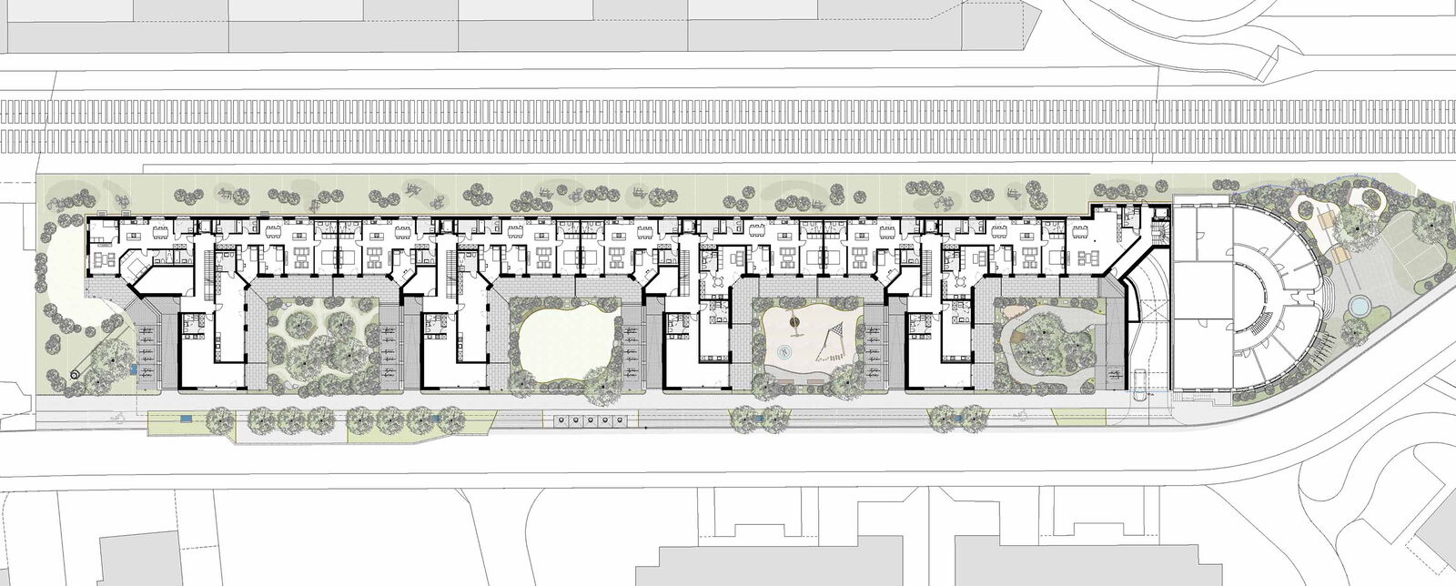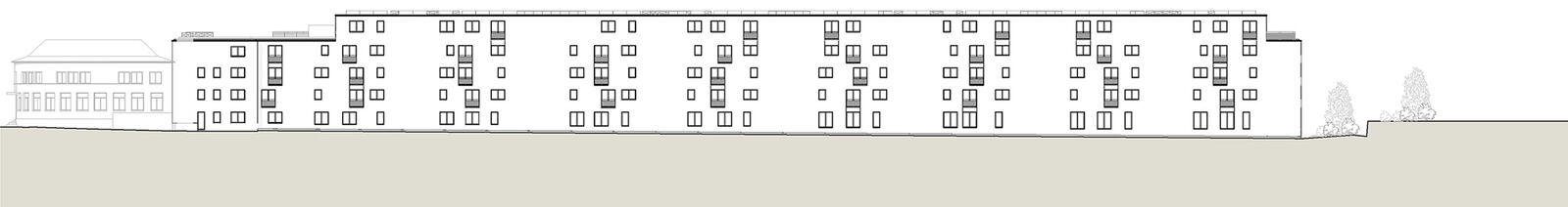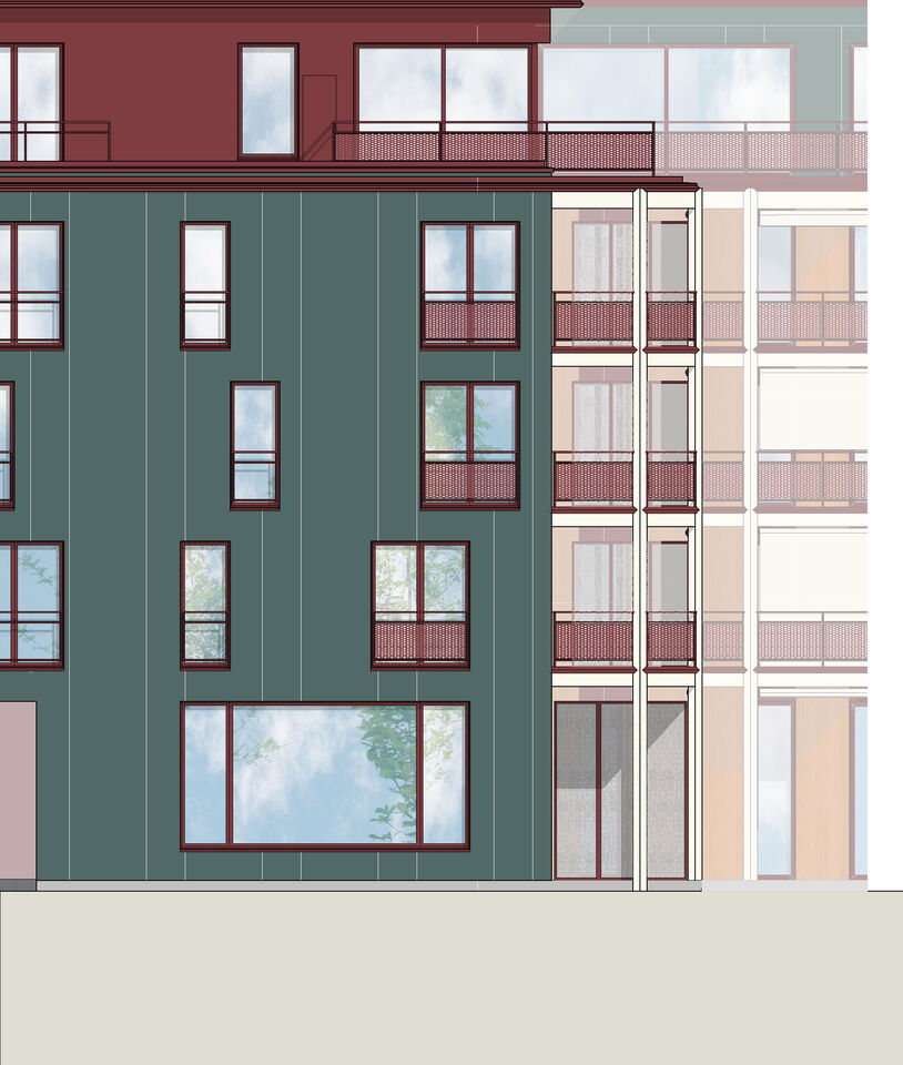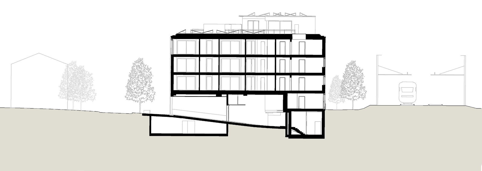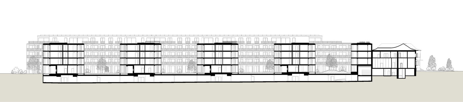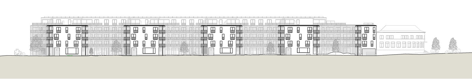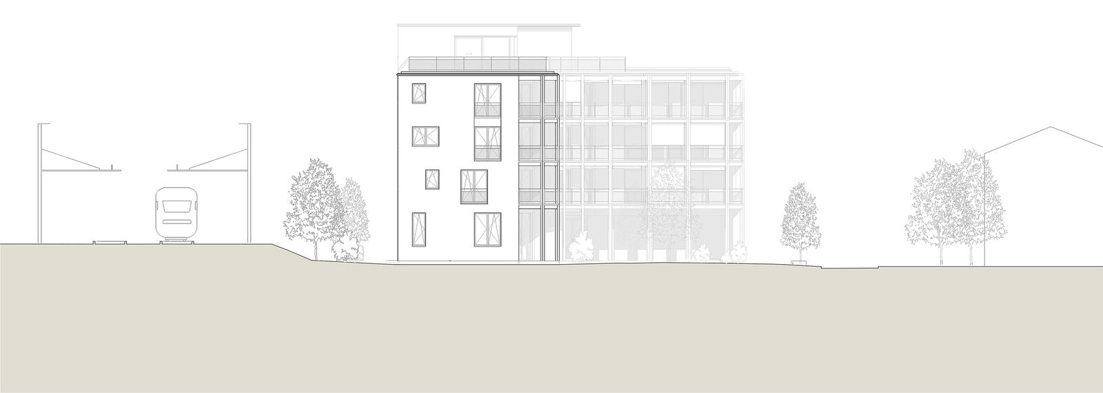 Als Neuentwicklung wird die bestehende Gewerbehalle im nördlichen Teil der Parzelle durch einen Neubau ersetzt. Die Gebäudestruktur des Neubaus schützt vor Bahnlärm und öffnet sich zum Wohnquartier. An den fünfgeschossigen Riegel docken die viergeschossigen, schmalen Kämme an und nehmen zusammen mit dem zurückversetzten Attika Rücksicht auf den Rundbau sowie das Wohnquartier. Als Pendant zum bestehenden «Gewerbebau Frikart», wird das nördliche Ende des Riegels mit einer, nach innen gerundeter Form abgeschlossen.