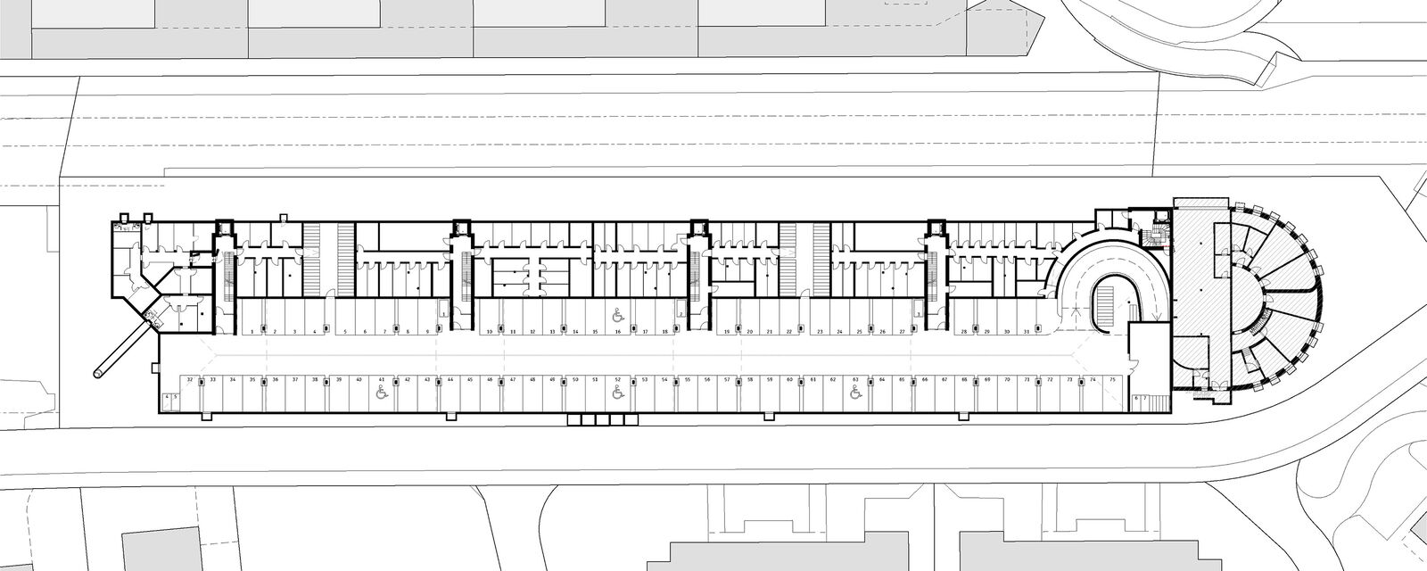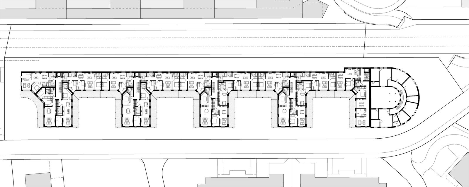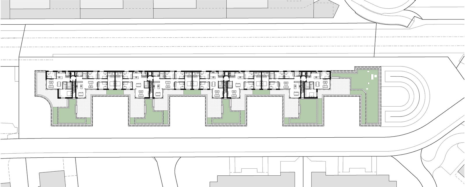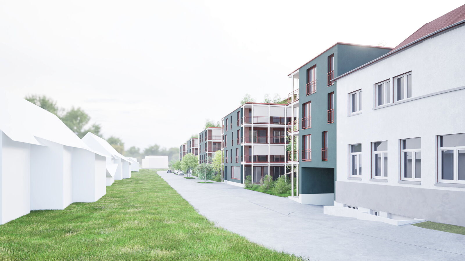 Als Neuentwicklung wird die bestehende Gewerbehalle im nördlichen Teil der Parzelle durch einen Neubau ersetzt. Die Gebäudestruktur des Neubaus schützt vor Bahnlärm und öffnet sich zum Wohnquartier. An den fünfgeschossigen Riegel docken die viergeschossigen, schmalen Kämme an und nehmen zusammen mit dem zurückversetzten Attika Rücksicht auf den Rundbau sowie das Wohnquartier. Als Pendant zum bestehenden «Gewerbebau Frikart», wird das nördliche Ende des Riegels mit einer, nach innen gerundeter Form abgeschlossen.
