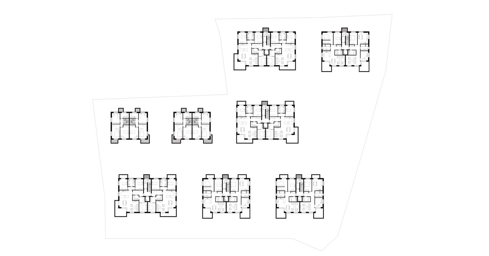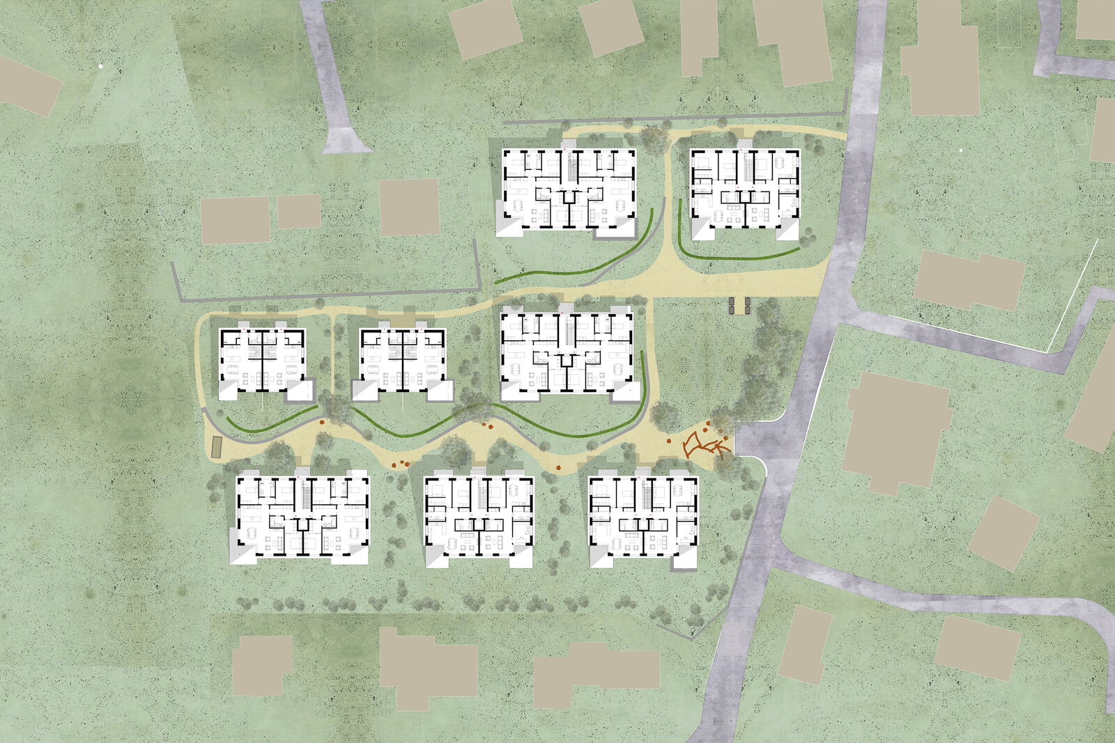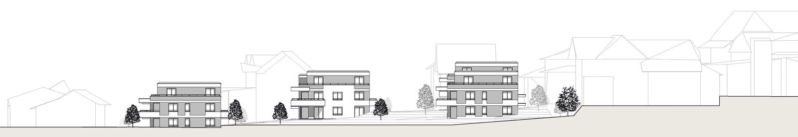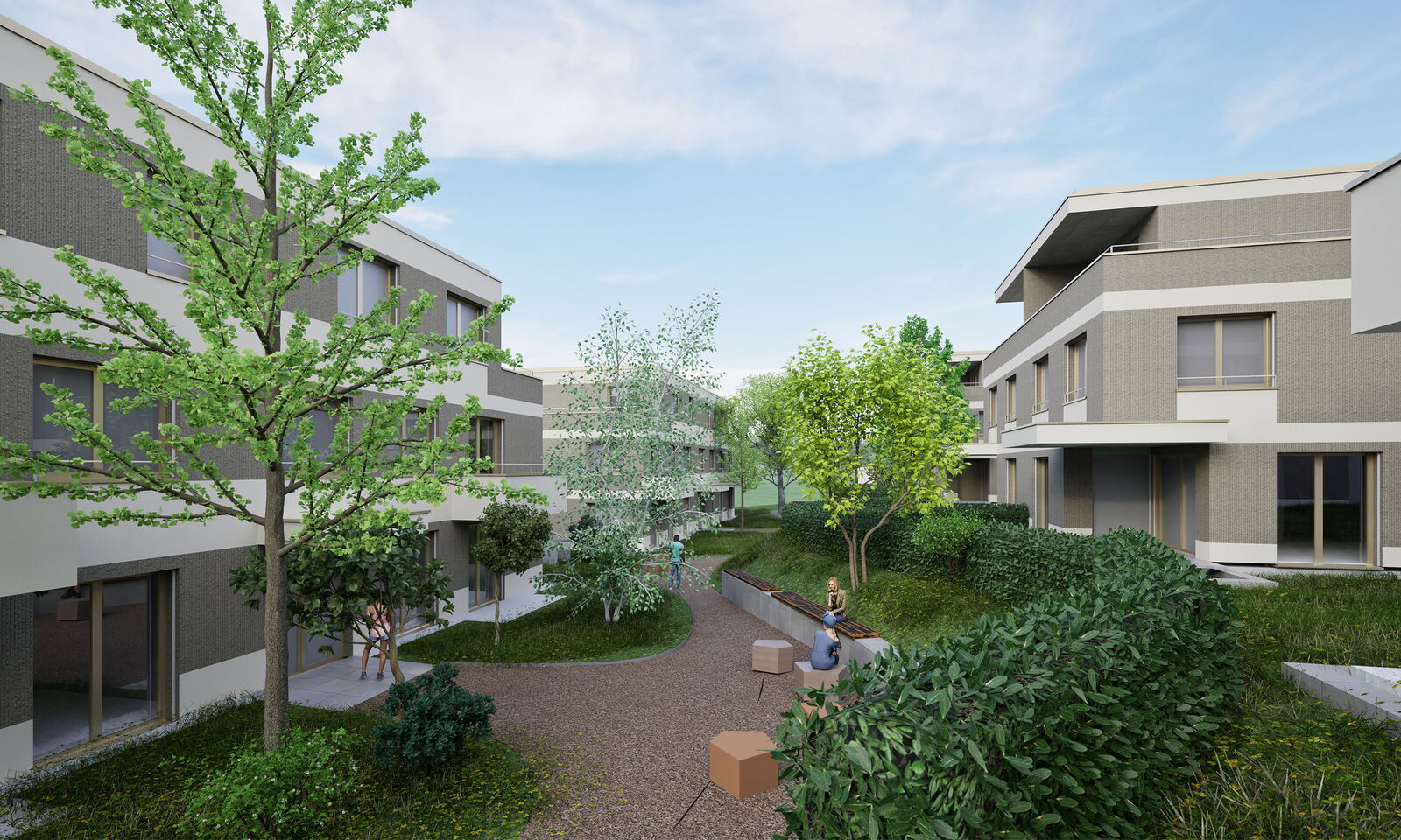 Die klare Linienführung der Gebäude wird durch verspringende Balkone und einer organischen Wegführung aufgebrochen, wodurch lebendige und abwechslungsreiche Räume entstehen. Unterschiedliche Putzstrukturen – eine Kombination aus Glatt- und Kammputz – verleihen den Gebäuden eine feine gestalterische Differenzierung und lassen sie als harmonisches Ensemble erscheinen. Das Projekt umfasst zwei Doppelhäuser, drei kleinere und drei größere Mehrfamilienhäuser mit 4.5 und 5.5 Zimmer Wohnungen.