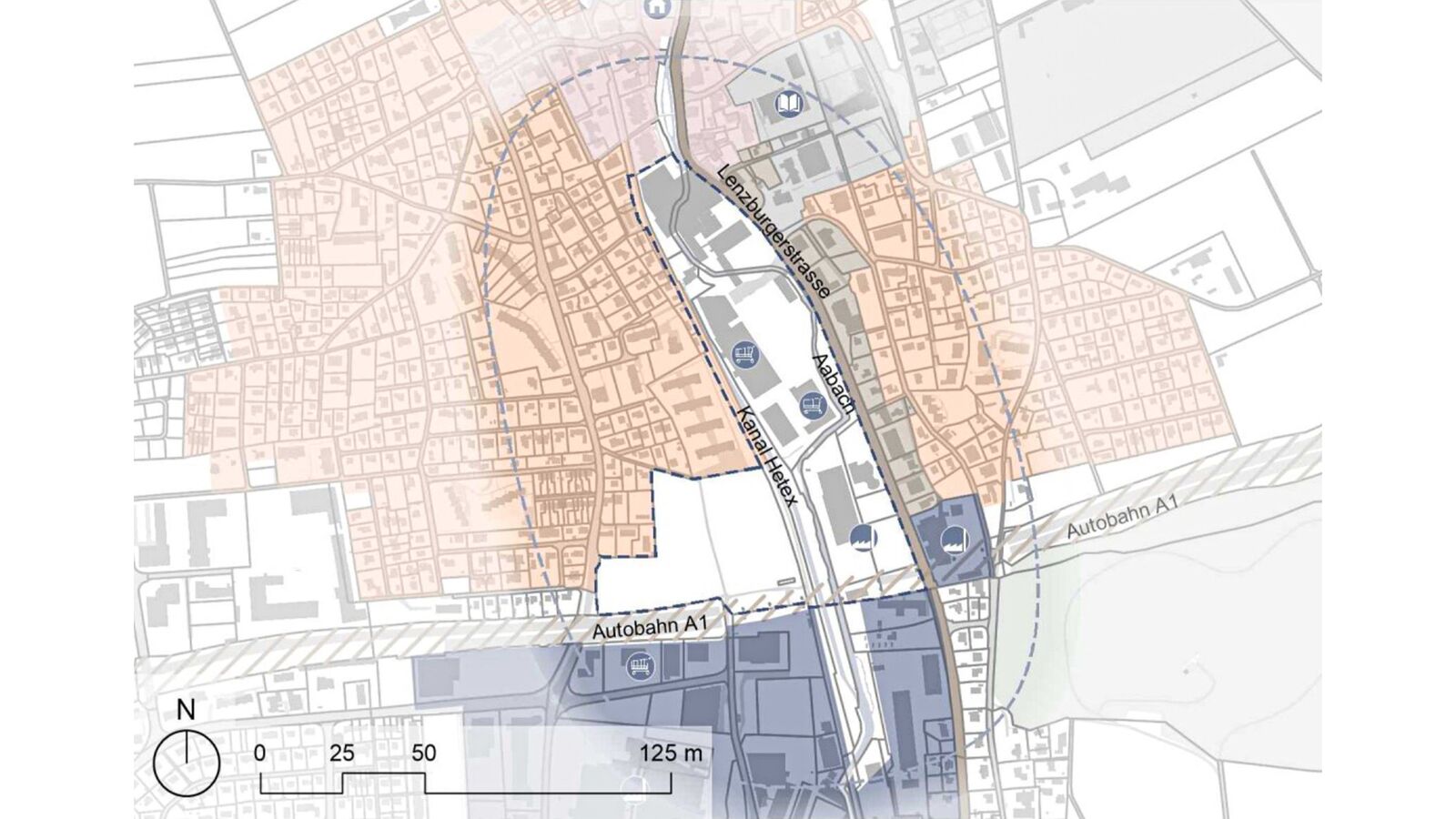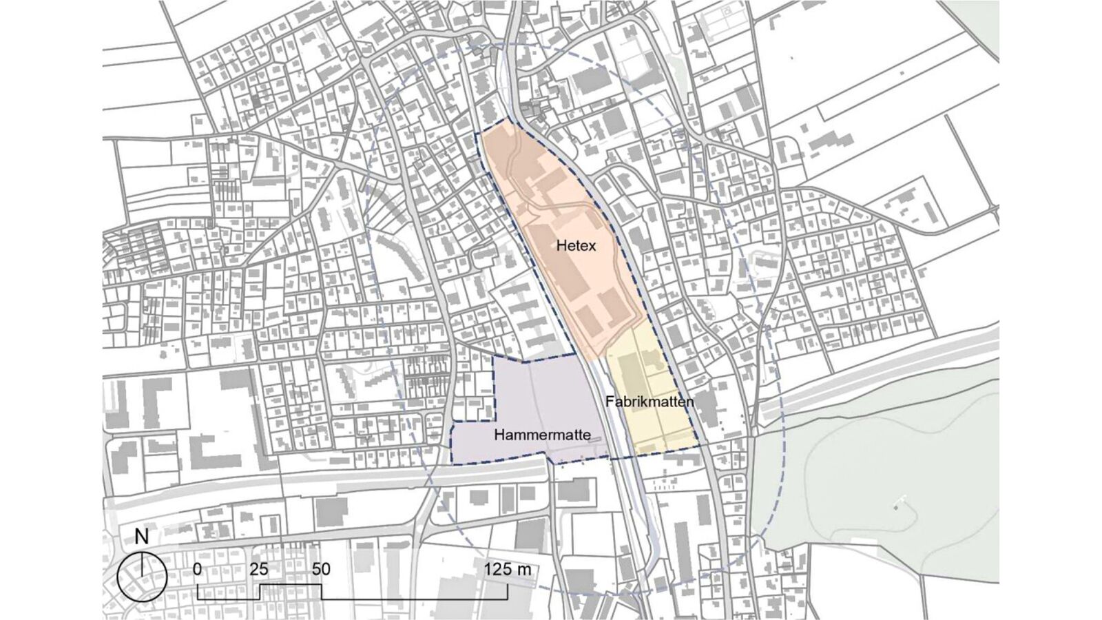 Die Gemeinde Niederlenz befindet sich zurzeit in der Gesamtrevision der allgemeinen Nutzungsplanung (Stand: abschliessende kantonale Vorprüfung, Januar 2025), wobei in dieser gefestigt werden soll, dass die Entwicklung der Gebiete Hammermatte, Hetex und Fabrikmatten (siehe Abbildung 3) in einem qualifizierten Dialogverfahren (bspw. Testplanung) aufgezeigt und anschliessend in separaten Gestaltungsplänen umgesetzt werden soll. Die Gemeinde Niederlenz, welche Eigentümerin der noch unbebauten Fläche «Hammermatte» ist, hat sich gemeinsam mit den weiteren Eigentümern entschieden, die Entwicklung des gesamten Gebiets voranzutreiben und mit