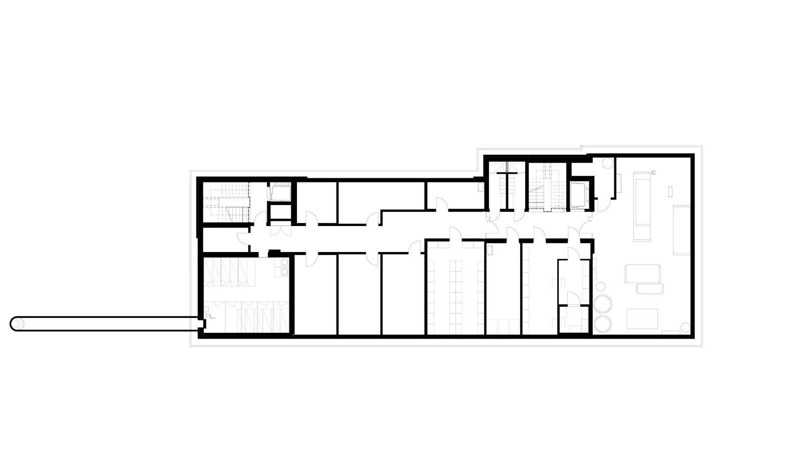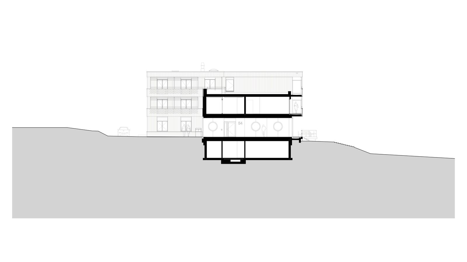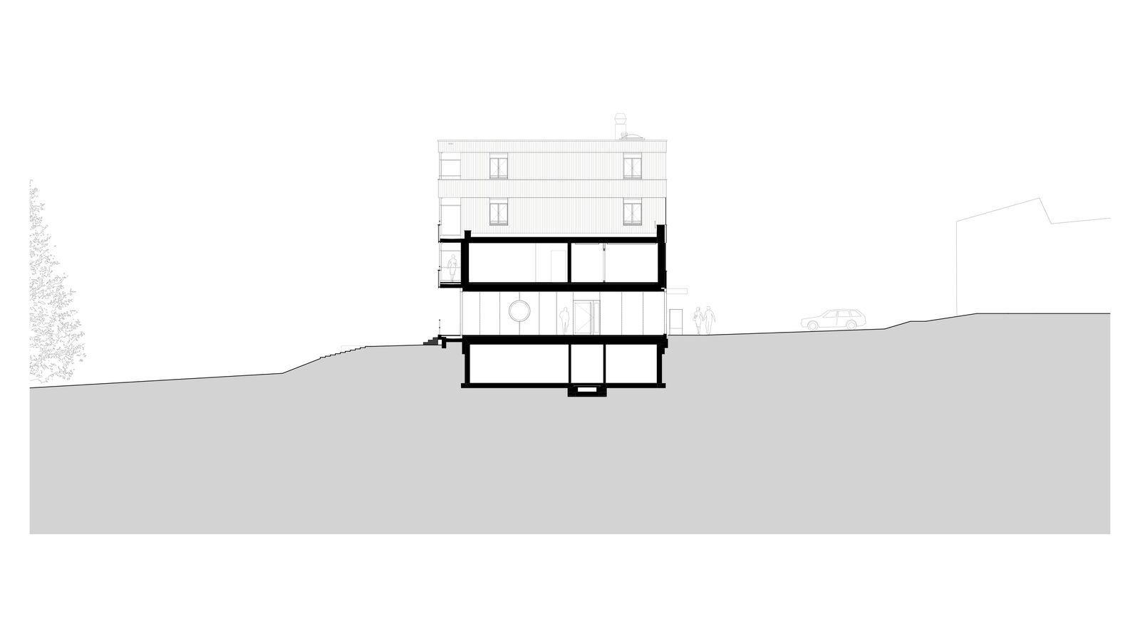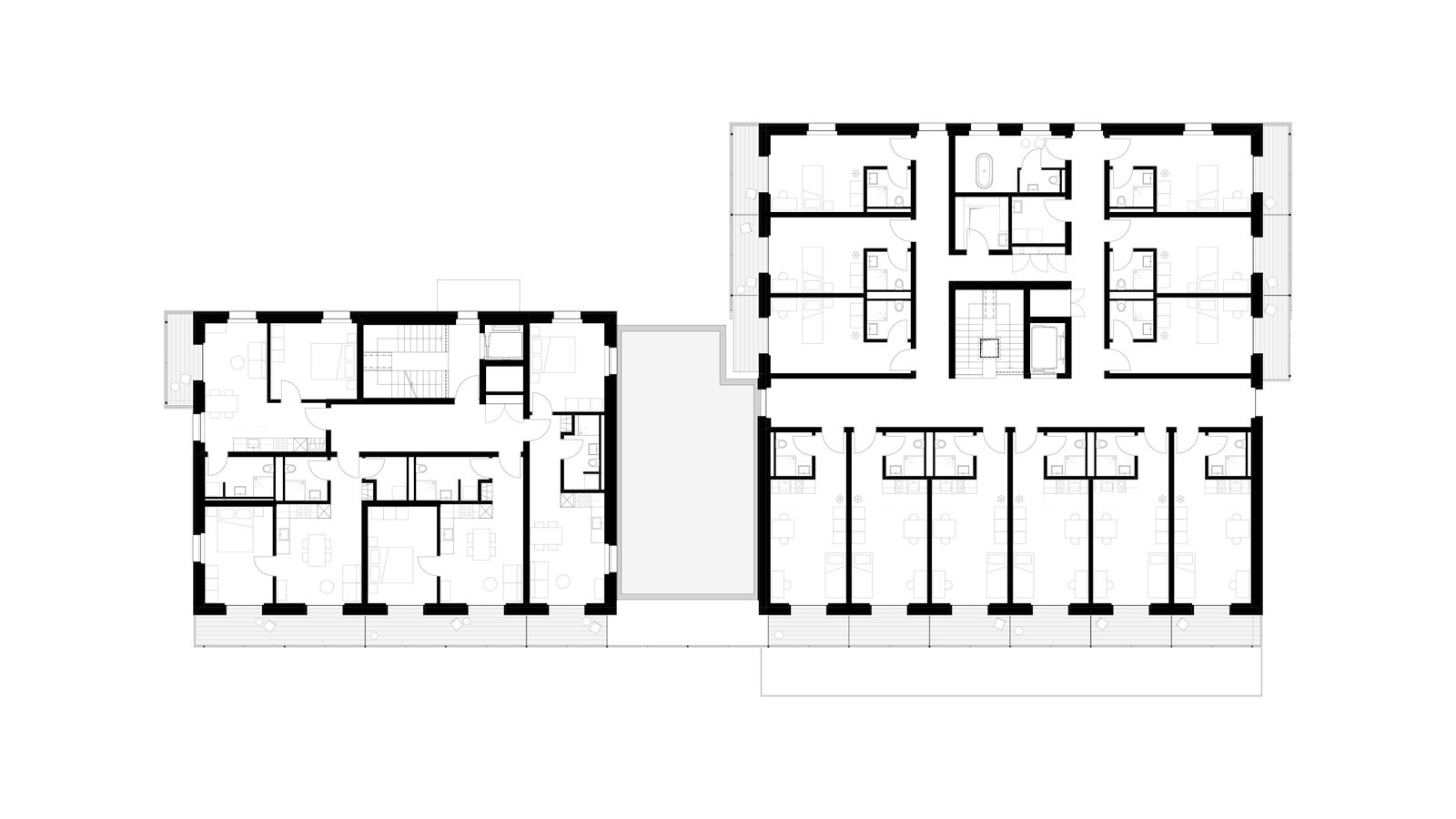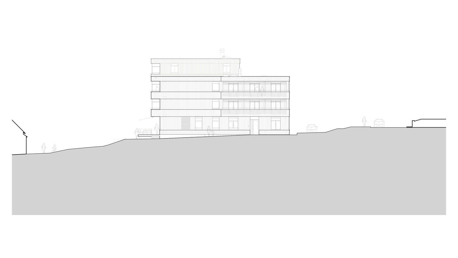 Der Ersatzneubau vereint das vielseitige Raumprogramm und passt sich den verschiedenen Massstäben des Kontextes an. Zwei rechteckige Gebäudeeinheiten werden im 1. Obergeschoss zu einem Gebäude verbunden, während im Erdgeschoss ein grosszügiger Durchgang frei bleibt. Ein zusammenhängendes Gebäude bringt aus betrieblicher Sicht Vorteile und ist für die vorgesehene Nutzung als Wohnheim nachvollziehbar. Das Raumprogramm ist dennoch kompakt angeordnet, dass der Baukörper einen vergleichsweisen geringen Fussabdruck aufweist. Die Volumetrie ist in der Höhe differenziert und im Grundriss versetzt und passt sich so der unmittelbaren Umgebung an.